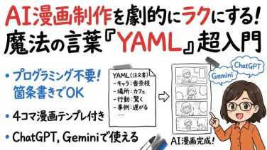 AI漫画制作に革命!YAML(ヤムル)を使えば、初心者でも簡単にプロンプトを整理してキャラクターの一貫性を保った4コマ漫画が作れます。基本の書き方から実例まで徹底解説。